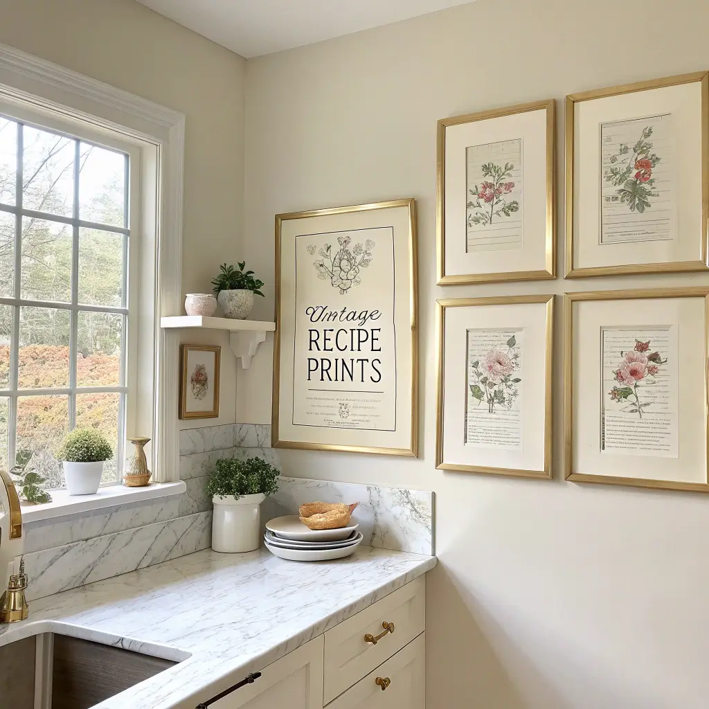 Use matching frames for a cohesive look, or mix vintage frames for a more eclectic vibe. Standard 8×10 or 5×7 frames work well for most recipe prints. Group them together on one wall section — a cluster of 4–6 framed recipes creates a charming focal point that also serves as a practical reference when you’re cooking.