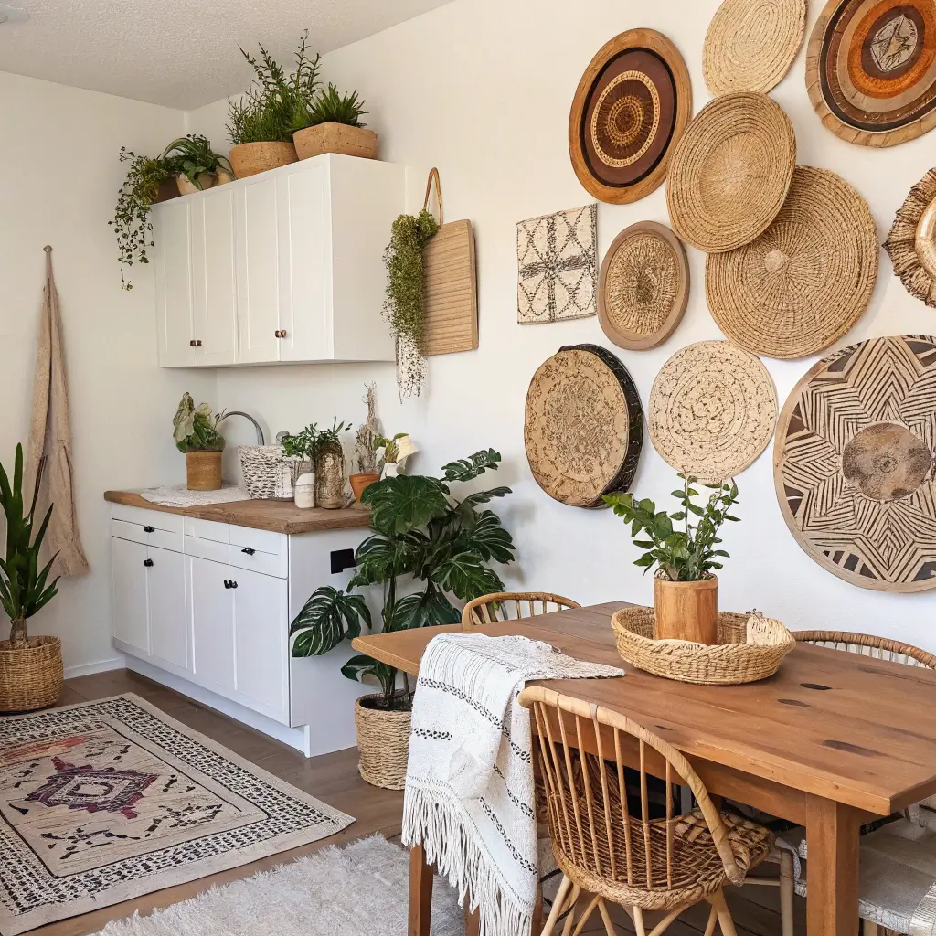 This one might surprise you, but woven baskets on a wall create one of the most striking and textured kitchen wall decor displays you can imagine. The organic shapes, natural materials, and varied patterns add depth and warmth that flat prints simply can’t match.