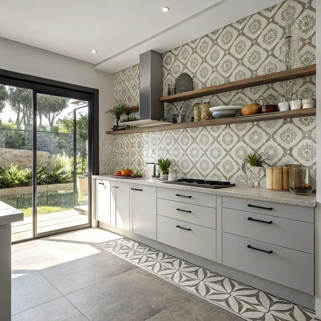 • Moroccan or Mediterranean patterns — Bold and colorful; perfect for adding personality to a neutral kitchen