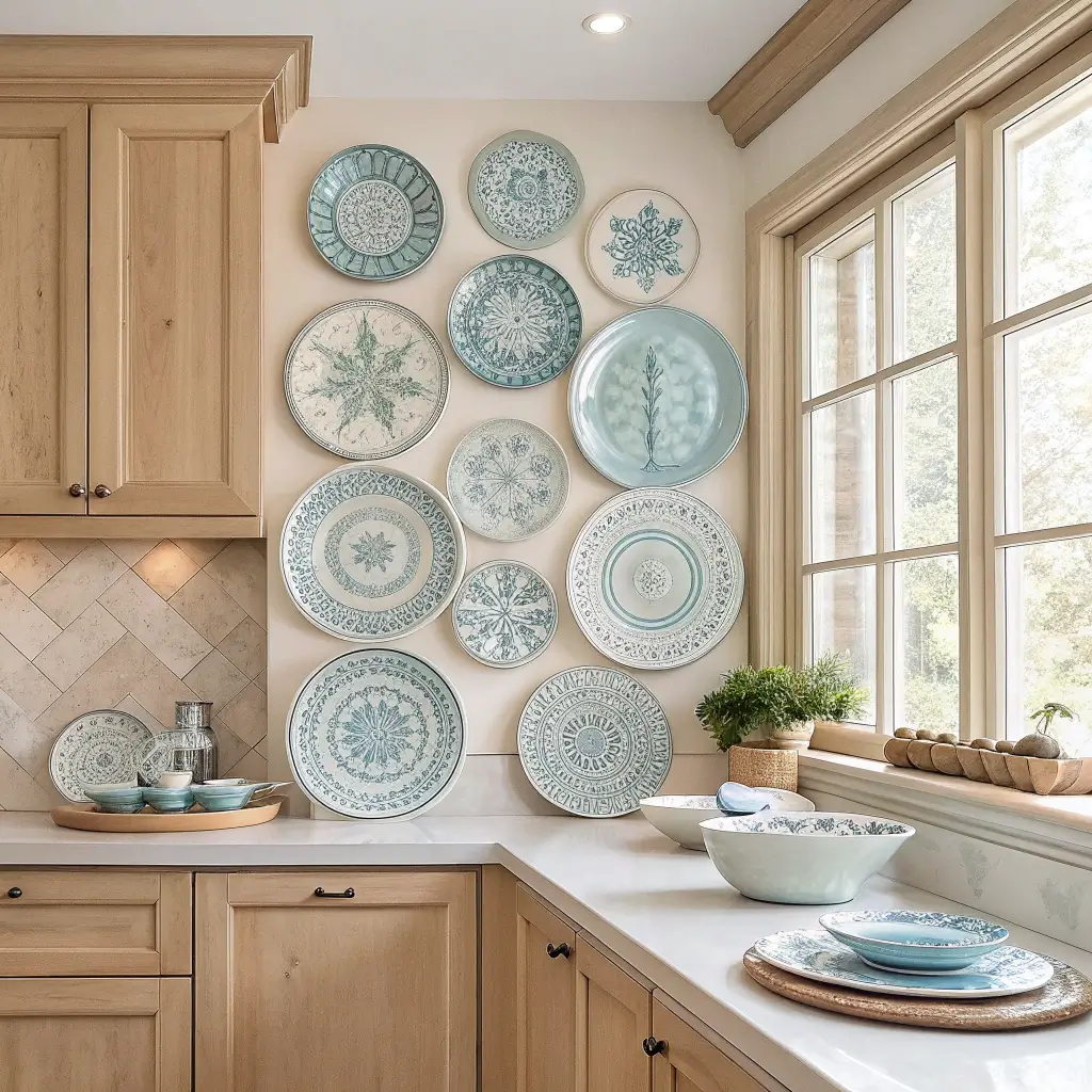 Last but absolutely not least, the decorative plate wall display. This is old-school kitchen wall decor that’s made a massive comeback in recent years, and for good reason. When done right, a plate wall looks elegant, collected, and deeply personal.