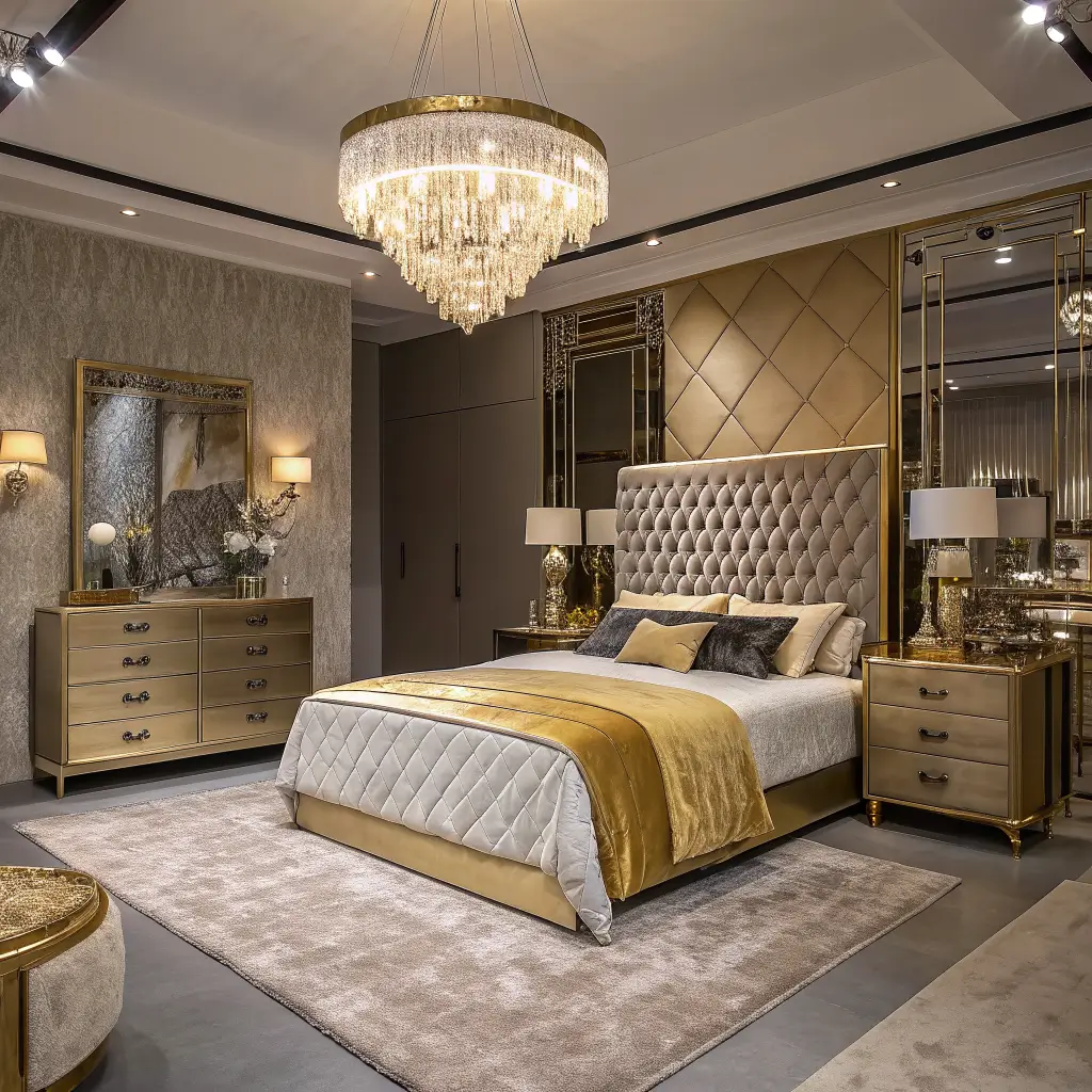 - Decorative objects: Gold trays on nightstands, gold-toned vases, or a metallic throw pillow add finishing touches.