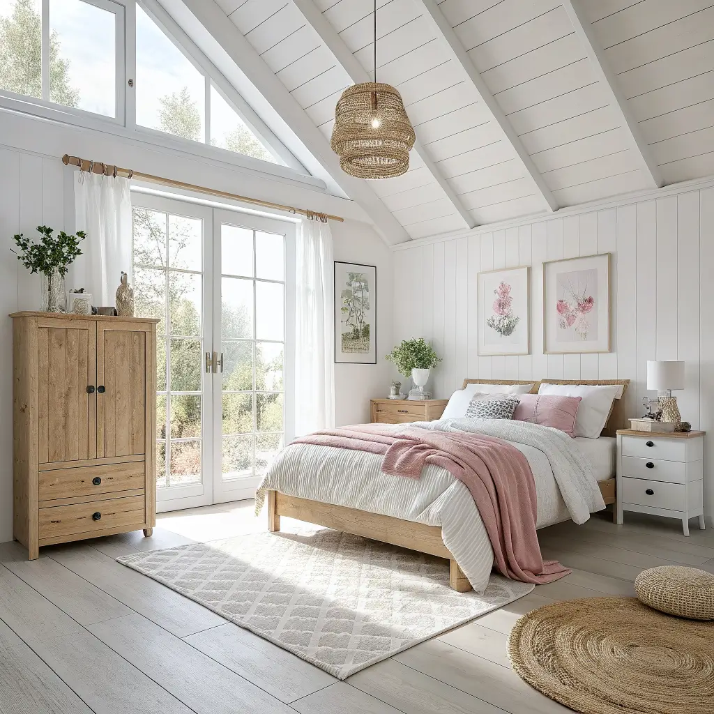 - Natural wood furniture: Light-toned woods like birch, ash, or pine keep the room feeling warm and organic. Avoid dark, heavy furniture.