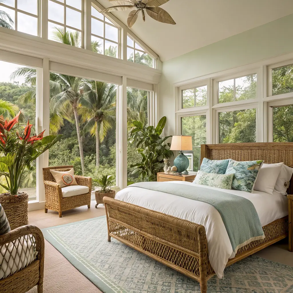 - Natural fiber furniture and accents: Rattan headboards, wicker chairs, bamboo side tables, and jute rugs anchor the tropical theme.
