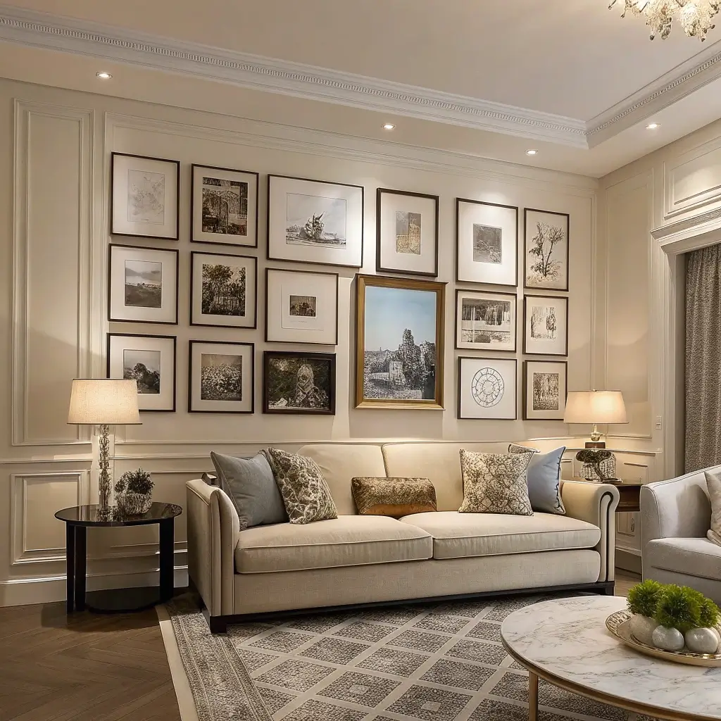 Gallery walls on massive walls need serious planning. You can’t just hang 10 frames and call it done – you need 30, 40, maybe 50 pieces to fill the space properly. Think of it as curating a personal museum.