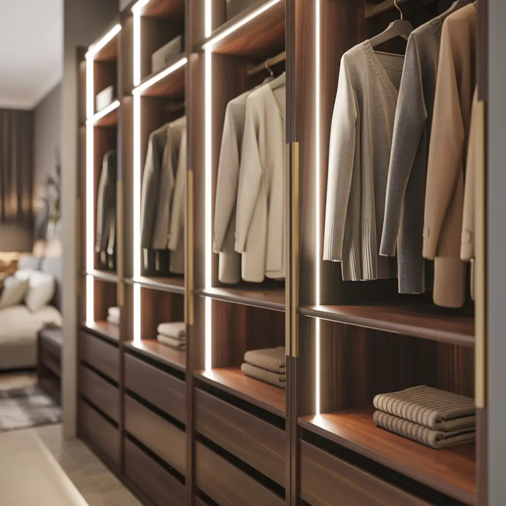 Modern wardrobes with built-in LED lighting go way beyond a single overhead bulb. We’re talking about motion-sensor activated lights that turn on when you open doors, strips that illuminate every shelf and drawer, and even color-temperature adjustable lights that help you see true colors.