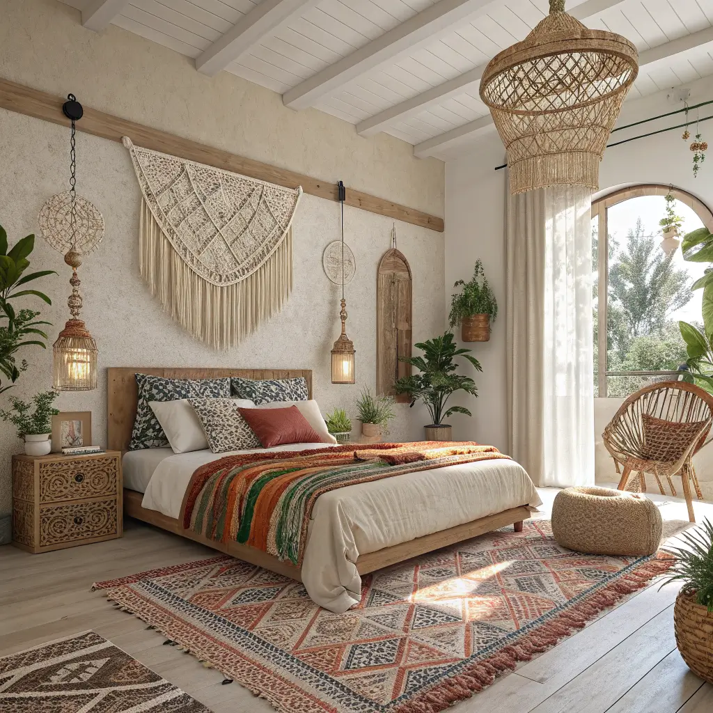 I have a friend who turned her master bedroom into a full-on boho paradise, and walking into that room feels like stepping into a Moroccan riad. Layered rugs, macramรฉ wall hangings, mismatched pillows in earthy tones โ it’s all so deliberately imperfect, and it works.