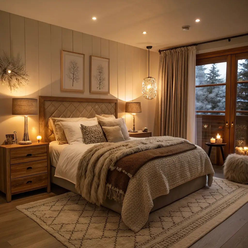 Nothing destroys coziness faster than a blinding overhead light. Swap that out for warm, layered lighting: