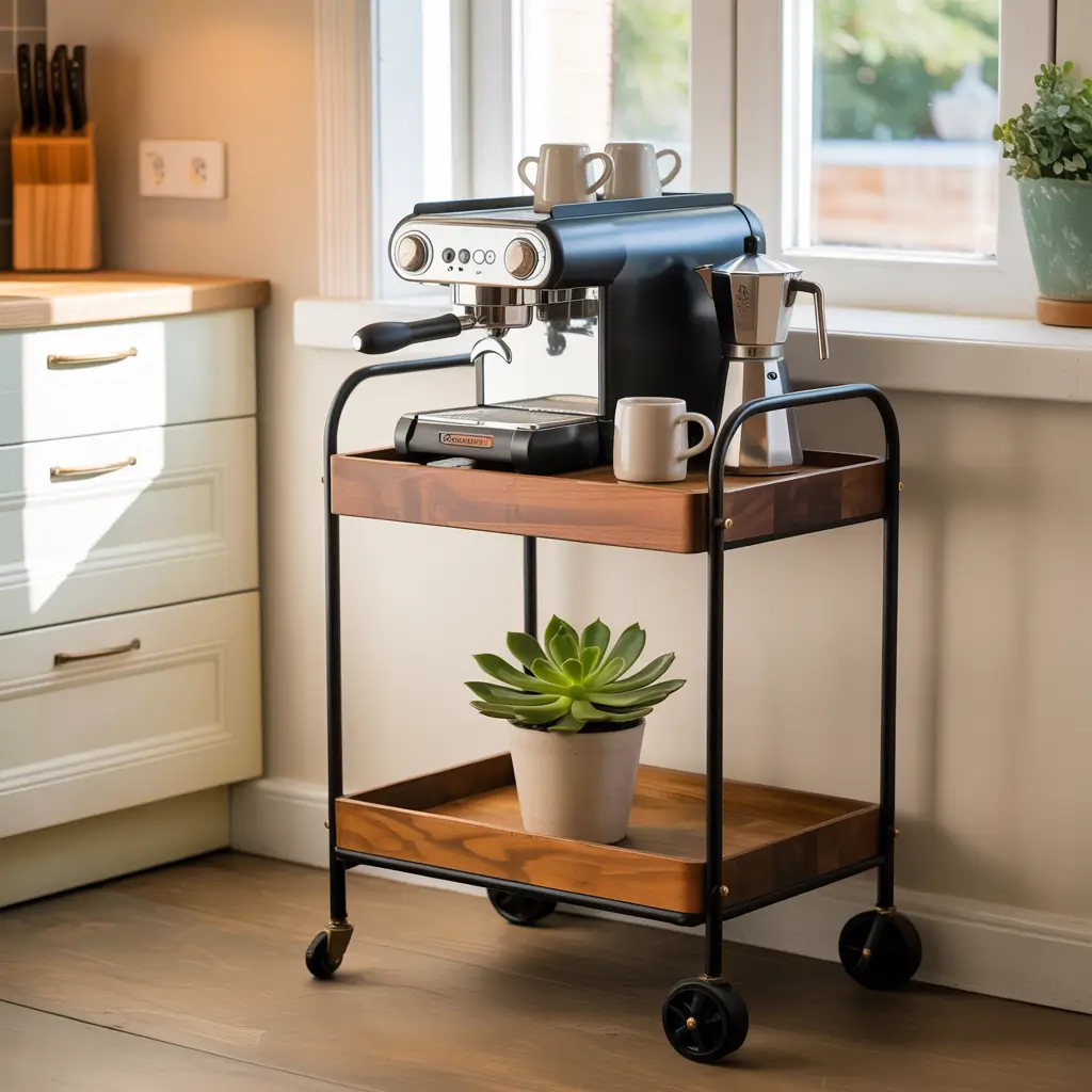 Rolling carts give you flexibility that fixed installations just can’t match. Need extra counter space for cooking? Roll that baby out of the way. Having friends over? Turn it into a self-serve coffee station in your living room. This setup works especially well in studio apartments where every piece of furniture needs to multitask.