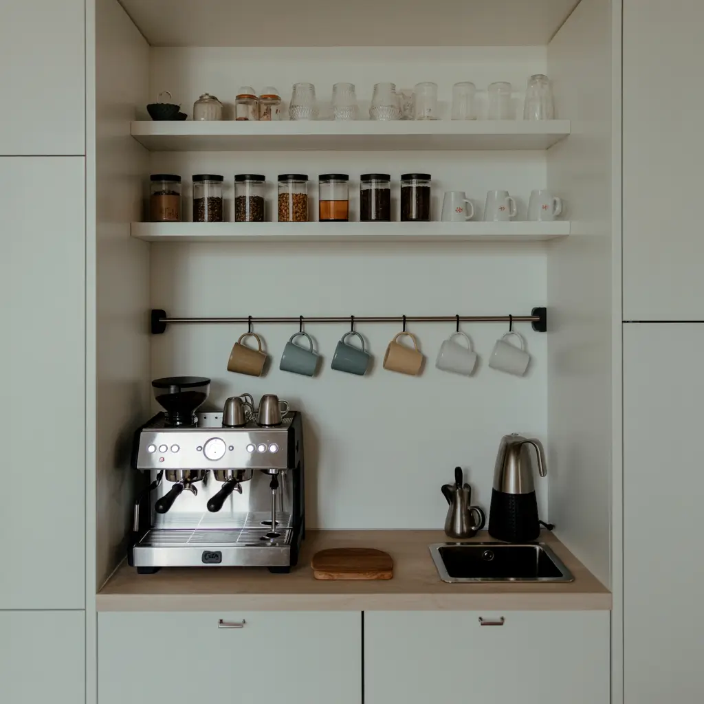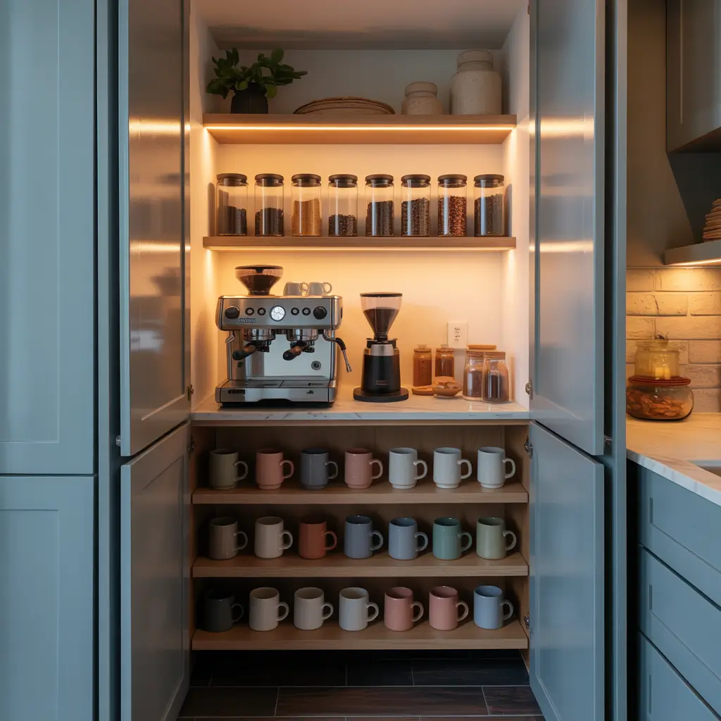 Want to know a secret? Some of the best coffee setups are completely hidden until you need them. If you’ve got a pantry, even a small one, you can create a pull-out or slide-out coffee station that disappears behind a door when not in use.