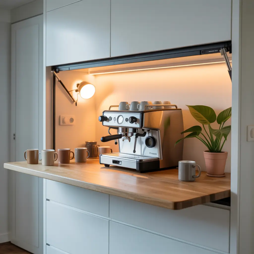 Okay, this one’s a bit more involved, but hear me out. Fold-down counters (also called drop-leaf or wall-mounted tables) give you a full coffee bar when you need it and completely disappear when you don’t.