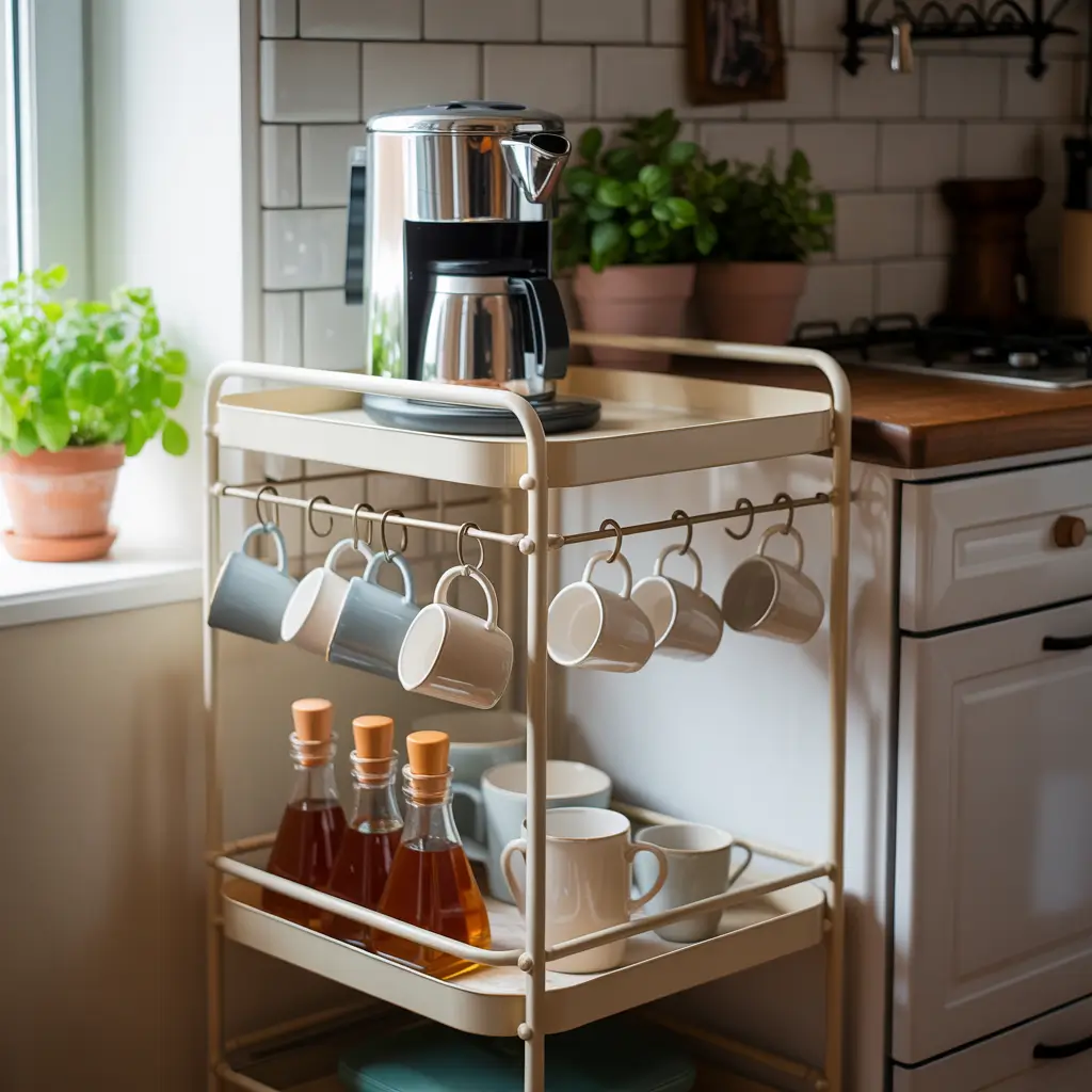 Okay, so this one’s my personal favorite, and here’s why: flexibility. Some days you want your coffee bar in the kitchen. Other days, maybe you’re working from your bedroom and want it right there next to your desk. A rolling cart gives you options, and when you’re living in a tiny space, options are everything.