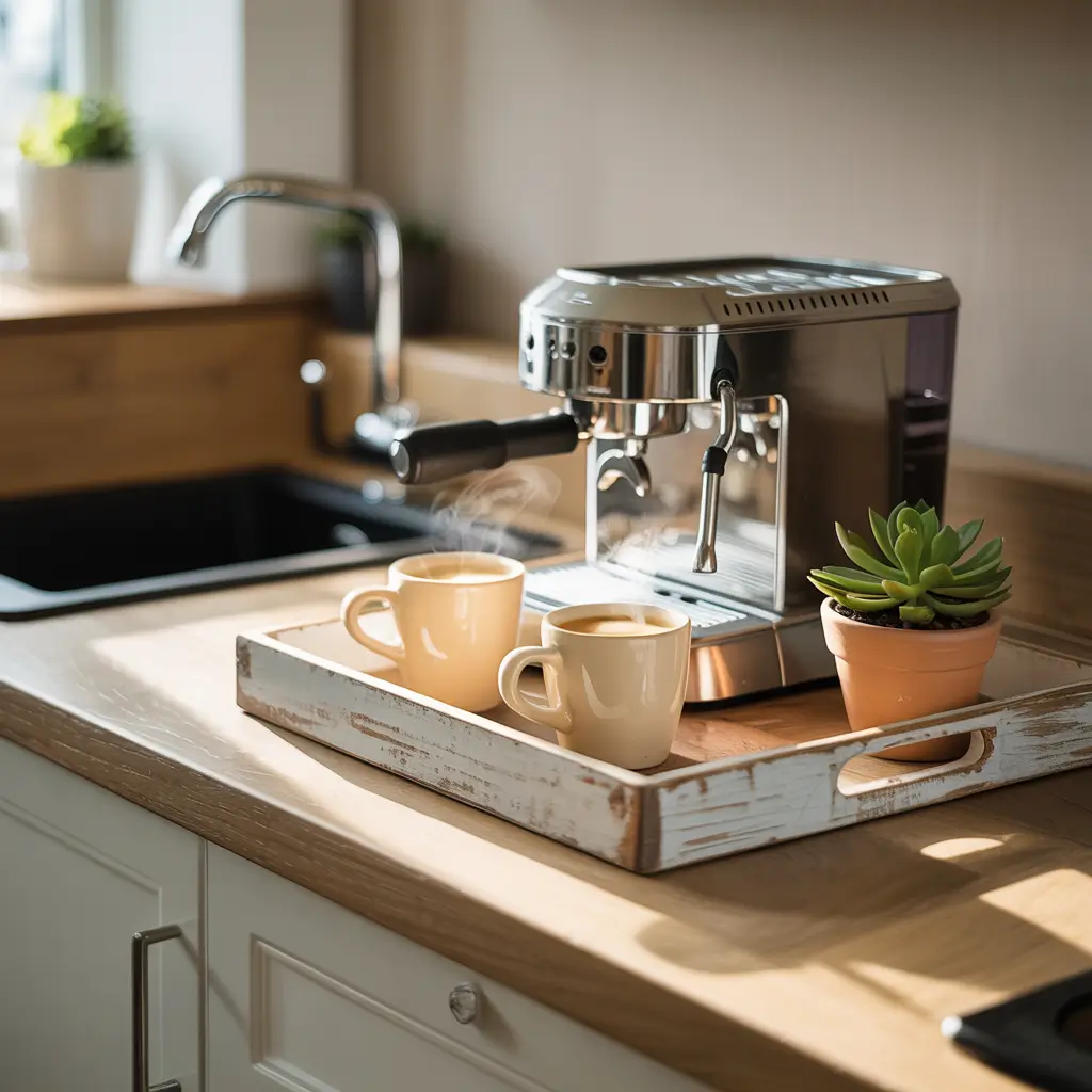This is basically the minimalist’s dream setup. You grab a stylish tray (wood, marble, whatever floats your boat), and you corral all your coffee essentials onto it. Coffee maker, sugar bowl, maybe a small plant because we’re not animals. The tray creates a defined “zone” for your coffee stuff, which psychologically makes it feel like an actual coffee bar rather than just clutter on your counter.