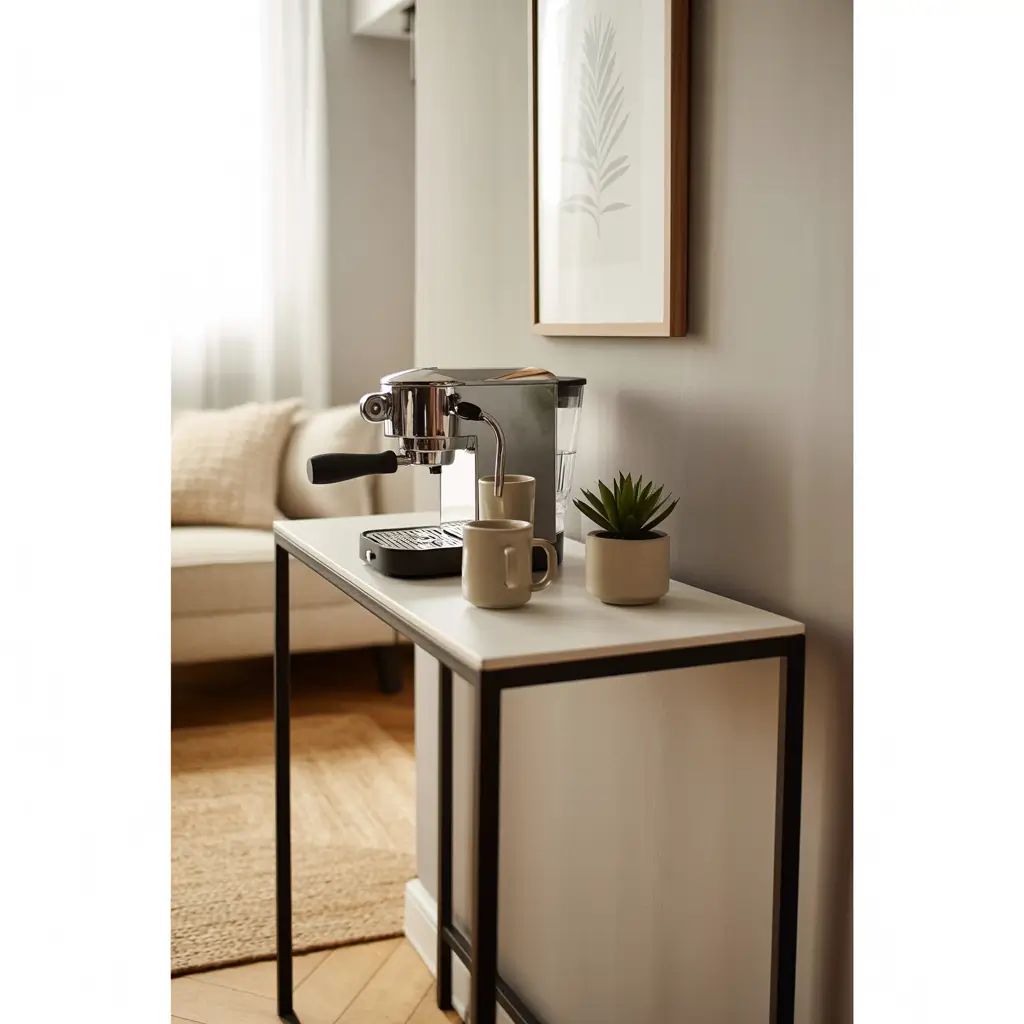 Got a hallway or a narrow strip of wall space? A slim console table might be your coffee bar solution. We’re talking those super narrow tables that are like 8-10 inches deep.