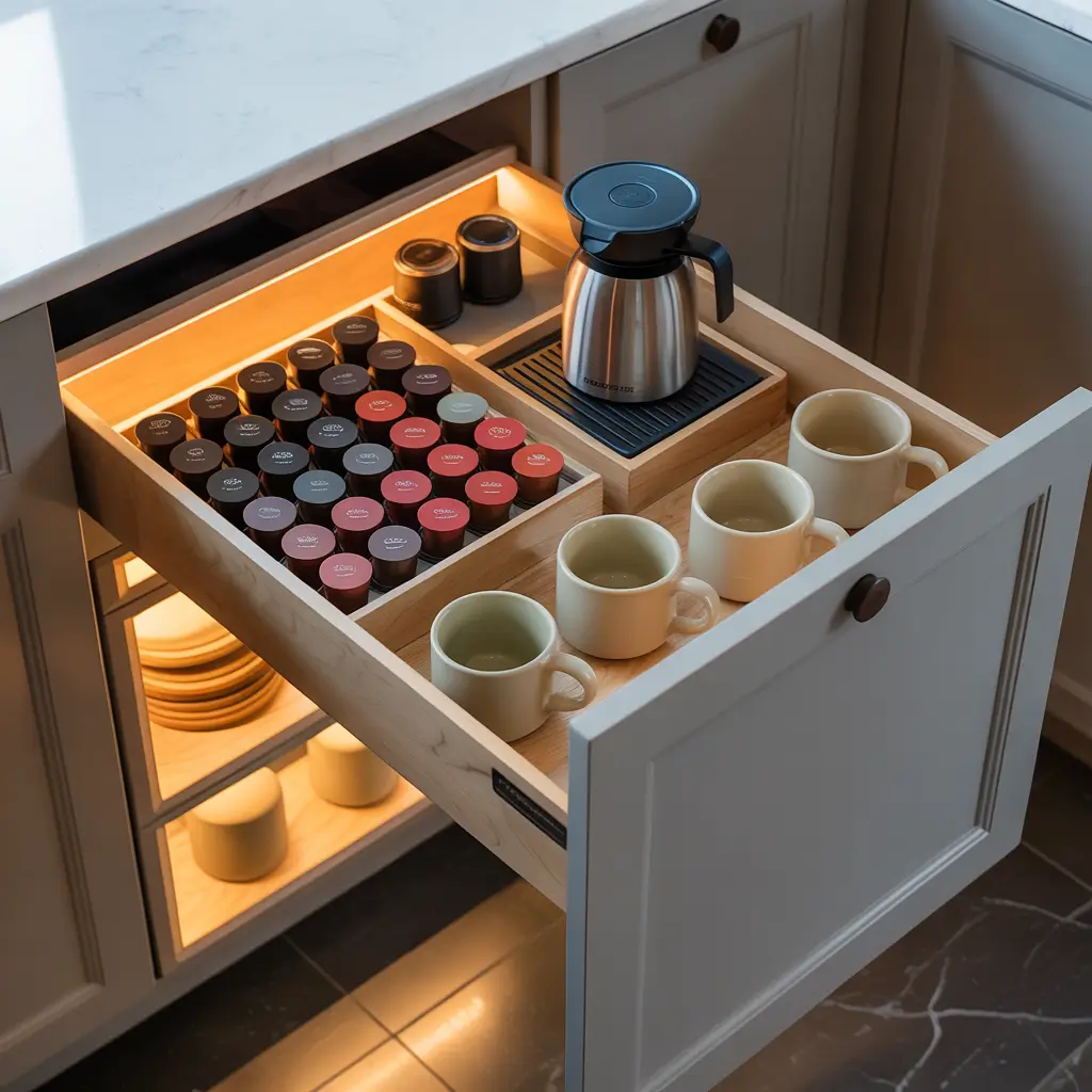 Okay, this one sounds weird, but hear me out. If you’ve got a deep drawer in your kitchen, you can convert it into a pull-out coffee station. I know, I know—sounds complicated. But it’s actually pretty straightforward and incredibly space-efficient.