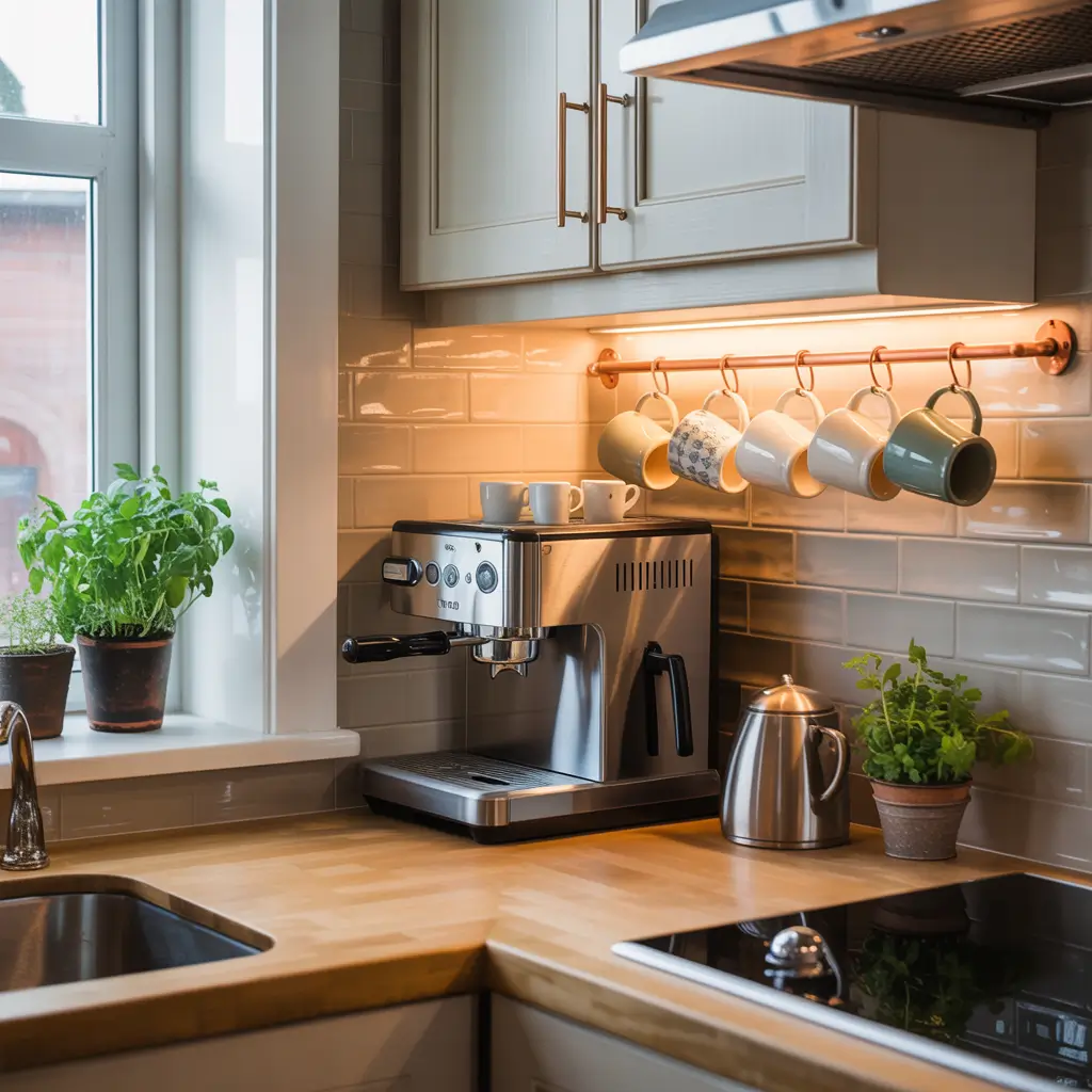 You can install under-cabinet hooks for hanging mugs, or even mount a small shelf under there for coffee pods and small supplies. Pair this with a small coffee maker on the counter directly below, and you’ve got a compact coffee station that uses vertical space brilliantly.