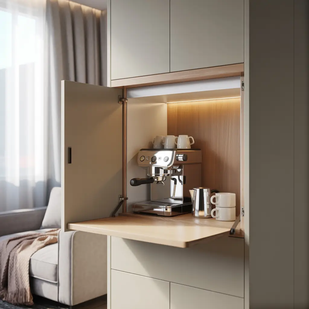 When you want coffee, you fold it down, and it creates a little workspace for your coffee maker and supplies. When you’re done, you fold it back up, and it’s flush against the wall—totally out of the way. Some designs even have storage built into the fold-down section for your coffee supplies.
