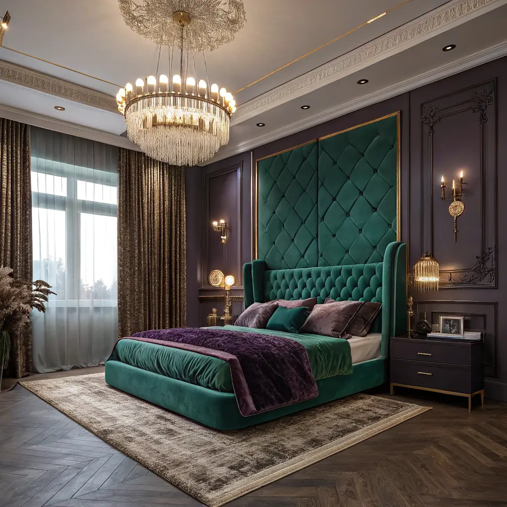 - An upholstered velvet headboard in jewel tones or deep neutrals—this is your centerpiece