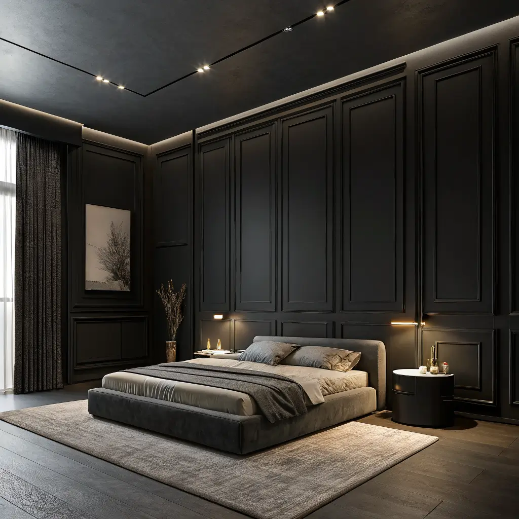 - Warm-toned wood accents—like a walnut nightstand or oak floor—break up the darkness just enough