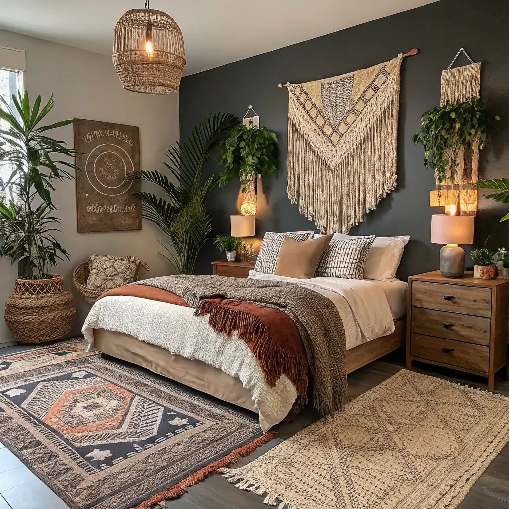 A moody boho bedroom thrives on collected, layered details. Here’s what pulls it together: