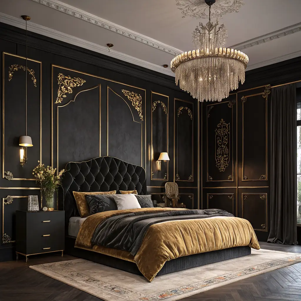 If subtlety isn’t your thing—and honestly, why should it be?—a black and gold master bedroom delivers maximum drama with zero apologies. This is one of the boldest moody master bedroom decor ideas on this list, and it’s not for the faint of heart.