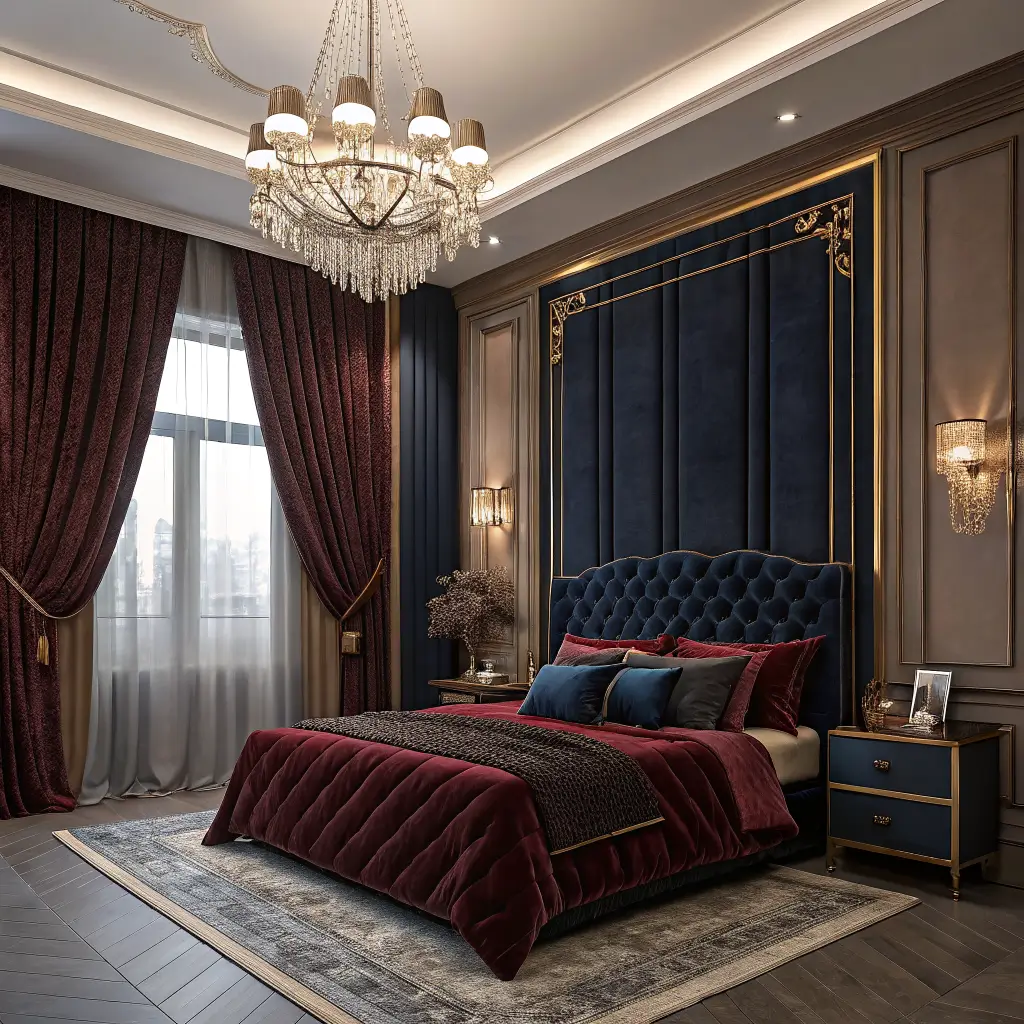 Pair that warm lighting with a palette of dusty roses, deep burgundies, soft mauves, and warm creams. Think heavy satin or silk bedding, draped fabrics, and an upholstered headboard in a rich, tactile material.