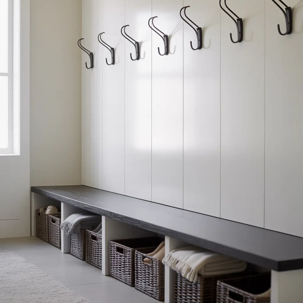 Sometimes you don’t need to reinvent the wheel—you just need to upgrade it. A modern mudroom bench with hooks is the Swiss Army knife of entryway solutions. It provides seating for putting on shoes, storage underneath, and hanging space above. Simple, efficient, and endlessly stylish.