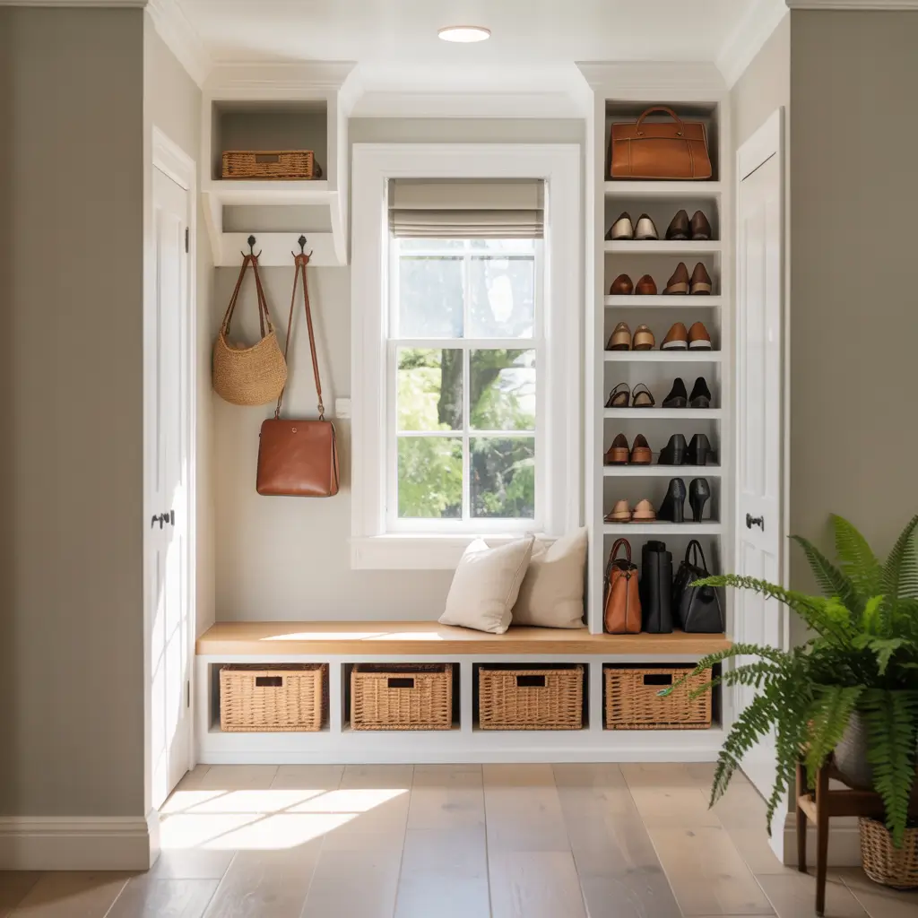 - Shoe cubbies that double as benches—sit on top, store below