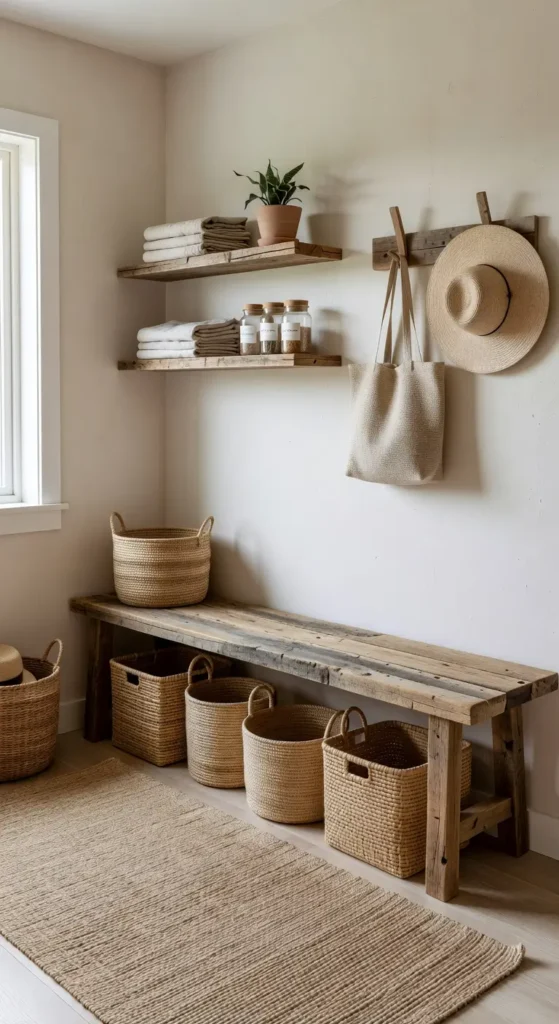 - Woven baskets under benches for a clean look