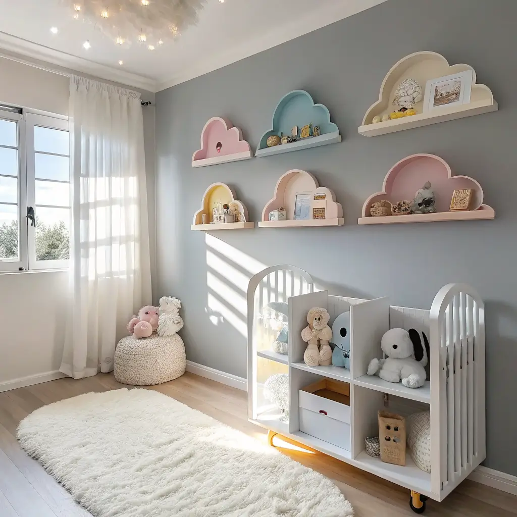 Okay, can we talk about how adorable floating cloud shelves are? These little beauties literally look like fluffy clouds hanging on your wall, except they actually hold stuff. I installed three of these in my niece’s nursery last year, and honestly, they might be my favorite thing in the entire room.