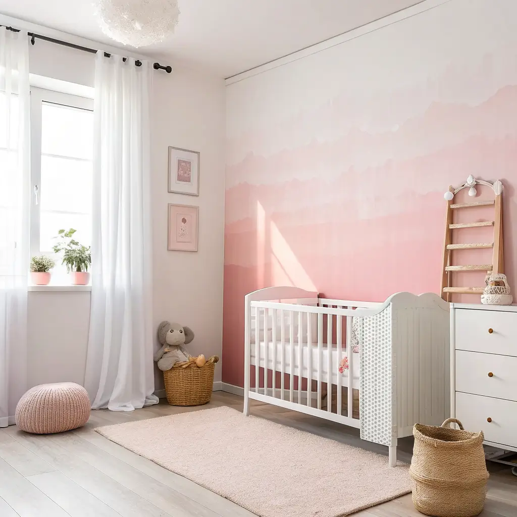 Color choices: Soft blues transitioning to white create a sky effect. Pinks to white feel feminine without being overwhelmingly girly. Greens to white bring in that nature vibe. Gray gradients are super popular for modern, minimalist nurseries.