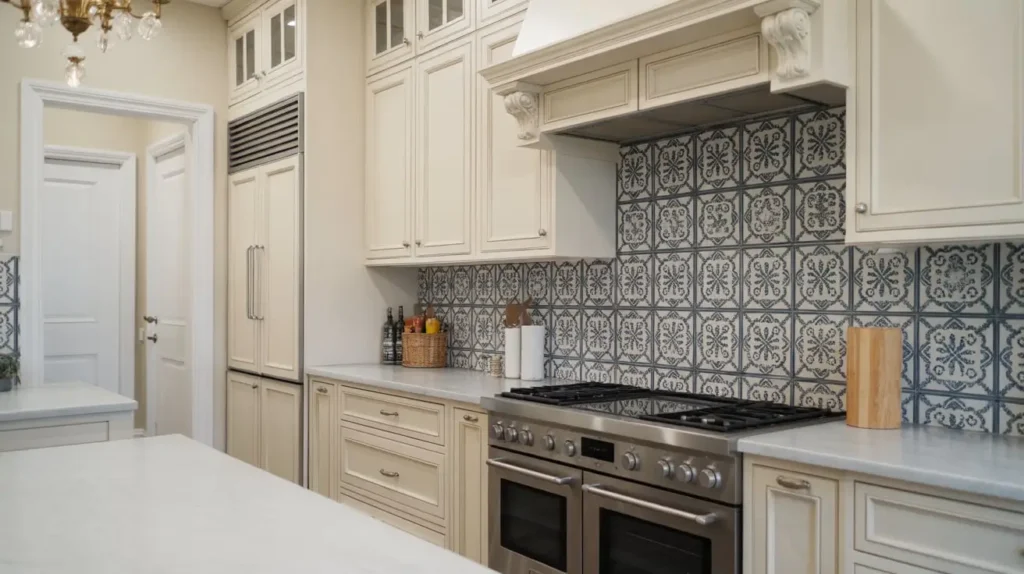 Colorful zellige tiles, patterned cement tiles, geometric designs, or even a bold solid color all work because those off white cabinets provide a calm backdrop. The backsplash becomes your kitchen’s jewelry—that special piece that makes the whole outfit pop.