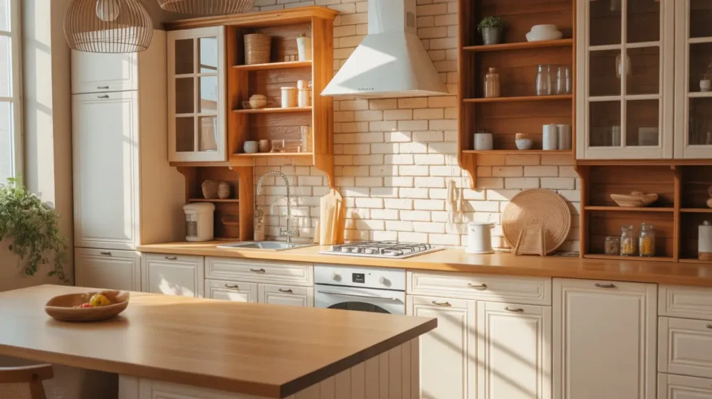 This approach works in multiple design styles too. Use reclaimed wood for rustic vibes, sleek teak for mid-century modern, or light oak for Scandinavian-inspired spaces. The off white cabinets serve as a neutral canvas that lets the wood really shine.