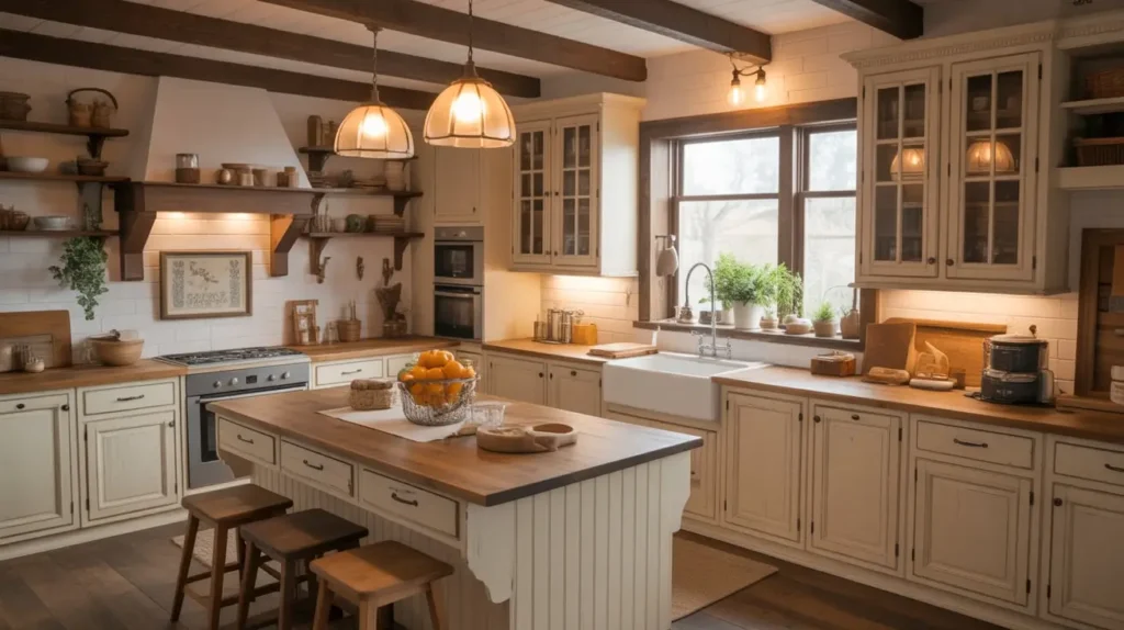 The beauty of this design lies in its versatility. You can go heavy on the rustic elements—think reclaimed wood beams and vintage accessories—or keep things more streamlined and modern. The off white cabinets adapt to whatever direction you choose. They’re like the Switzerland of kitchen design, honestly.