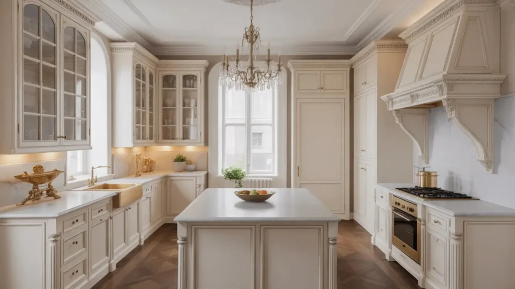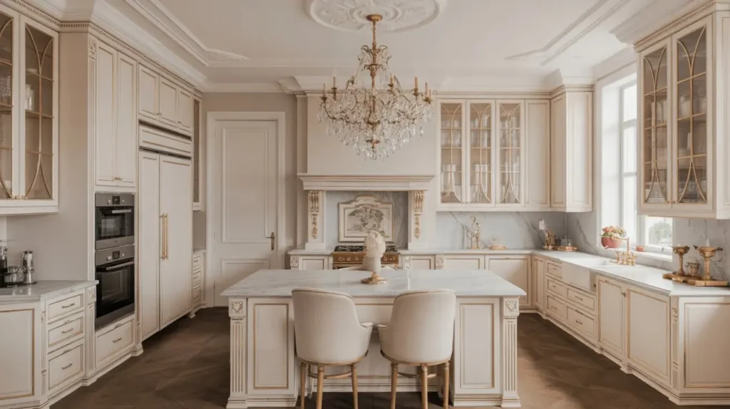 To complete this elegant look, add in some sophisticated details: crystal or brass hardware, a statement chandelier, and maybe some crown molding on those cabinets. You’re creating a kitchen that feels special, like every meal you cook here deserves a standing ovation.
