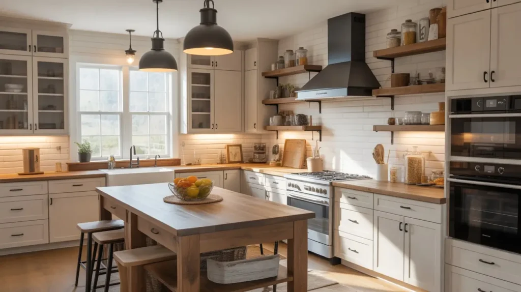 I love pairing off white shaker-style cabinets with black or oil-rubbed bronze hardware. The contrast is chef’s kiss. Add in some open shelving, maybe a farmhouse sink, and subway tile backsplash, and you’ve got yourself a kitchen that feels like home the second you walk in.