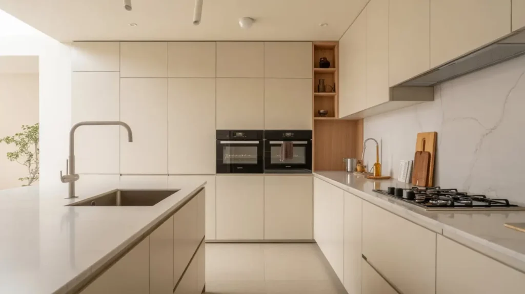 For this look, I recommend flat-panel cabinet doors with integrated handles or push-to-open mechanisms. Pair them with solid surface countertops in complementary neutral tones, and keep your color palette super tight—maybe two or three colors max.