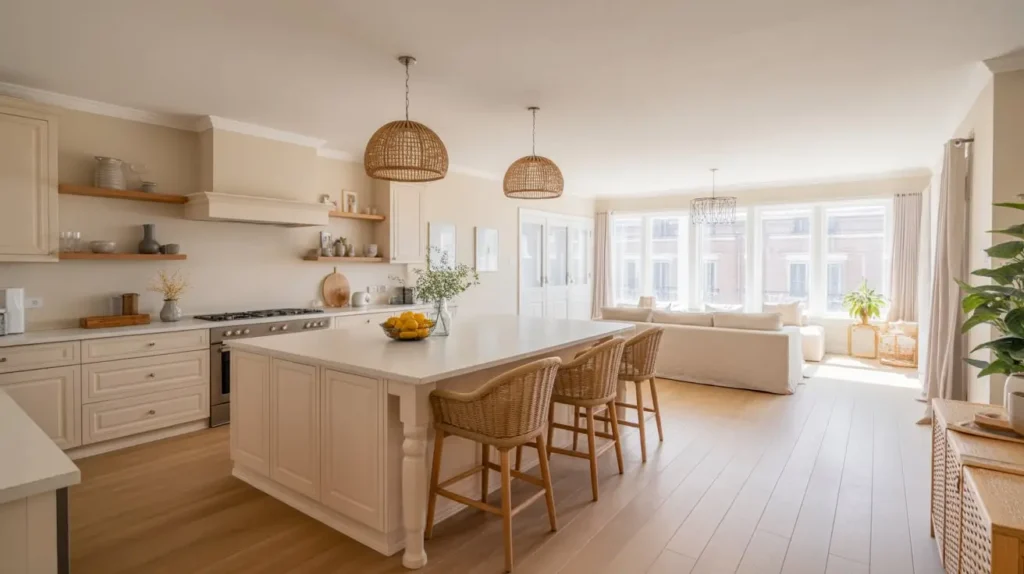 The neutral tone flows easily from room to room, creating cohesion throughout your open floor plan. You can tie everything together by repeating the off white color in other areas, using similar hardware finishes, or carrying materials across spaces.
