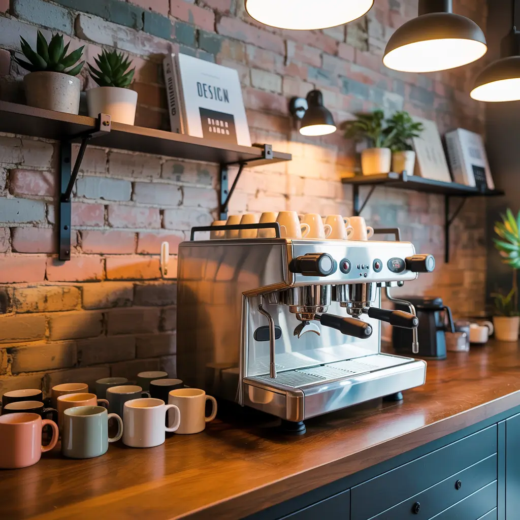 This style works exceptionally well in loft offices, creative agencies, or anywhere with exposed brick or concrete. It says “we’re cool and we know our coffee” without trying too hard.