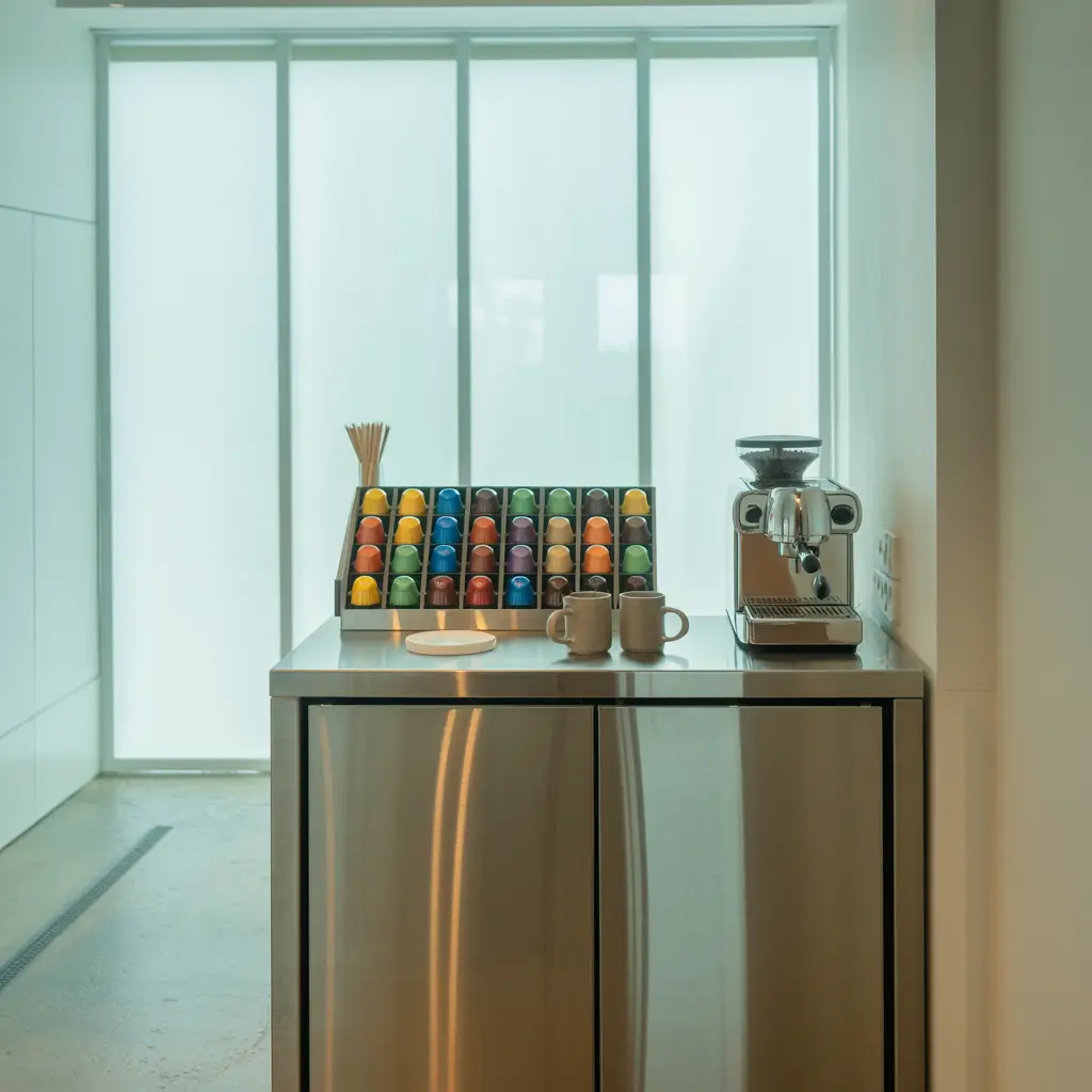 I’ve seen these work incredibly well in satellite offices, small meeting rooms, or even individual departments that want their own coffee setup away from the main kitchen. The trick is keeping it ruthlessly organized—with this little space, any clutter immediately looks chaotic.