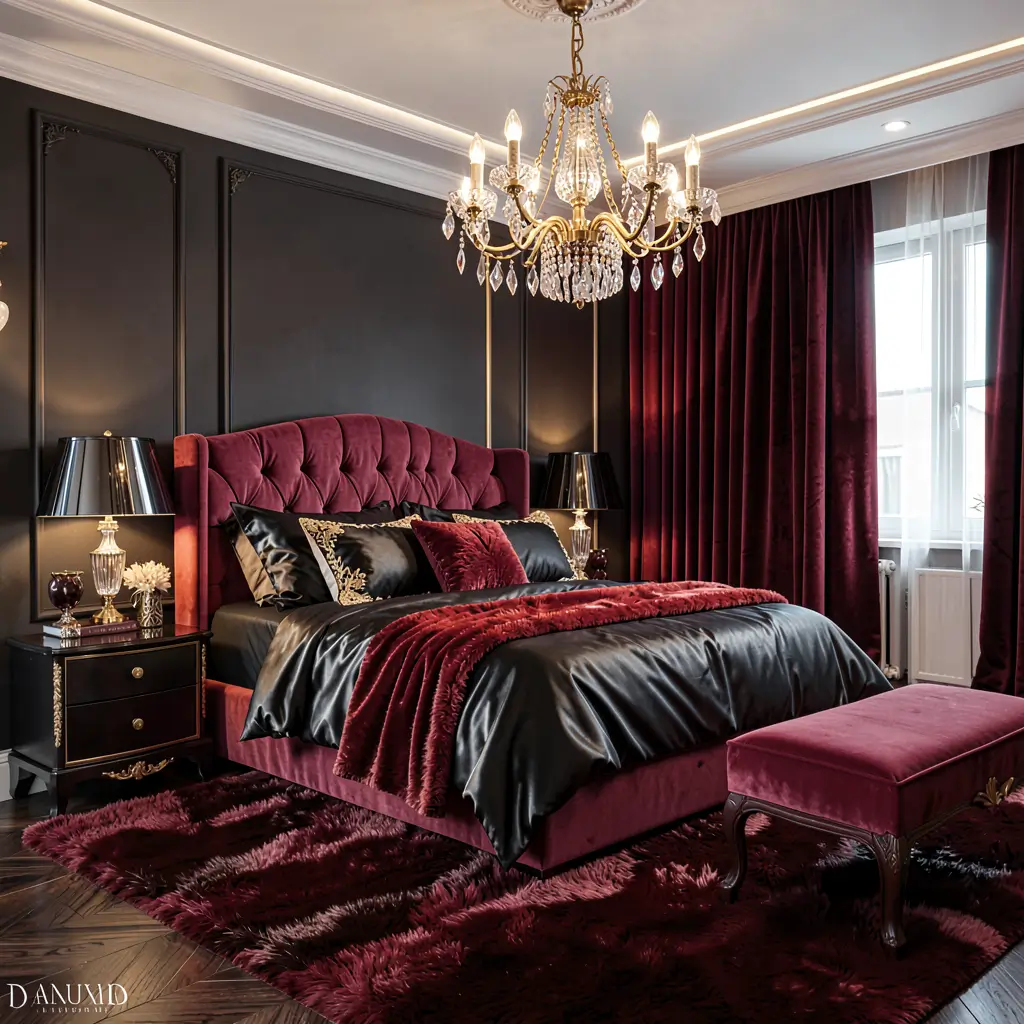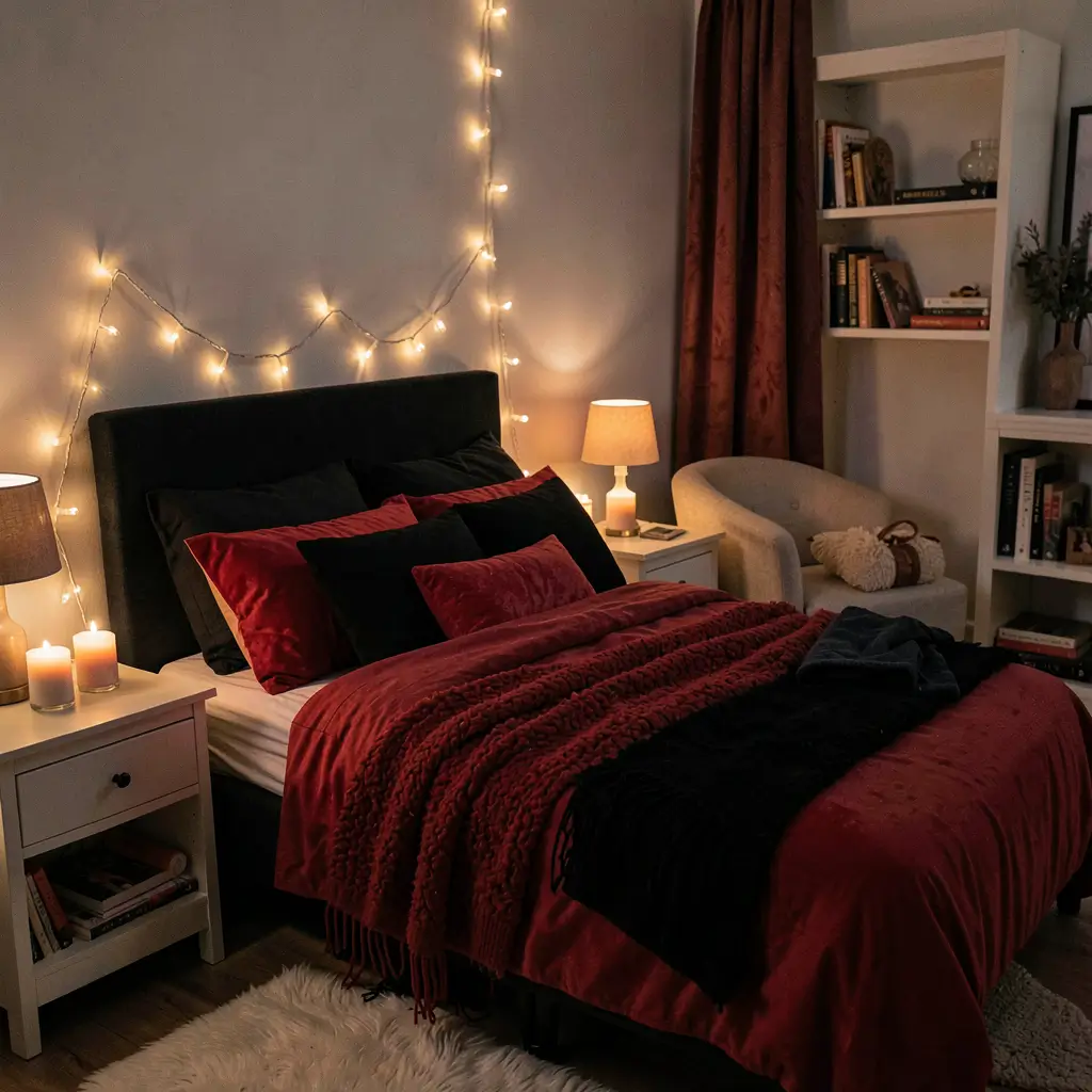 Velvet in red and black creates instant luxury that makes everything else in your bedroom look more expensive. This isn’t about having money; it’s about looking like you do.