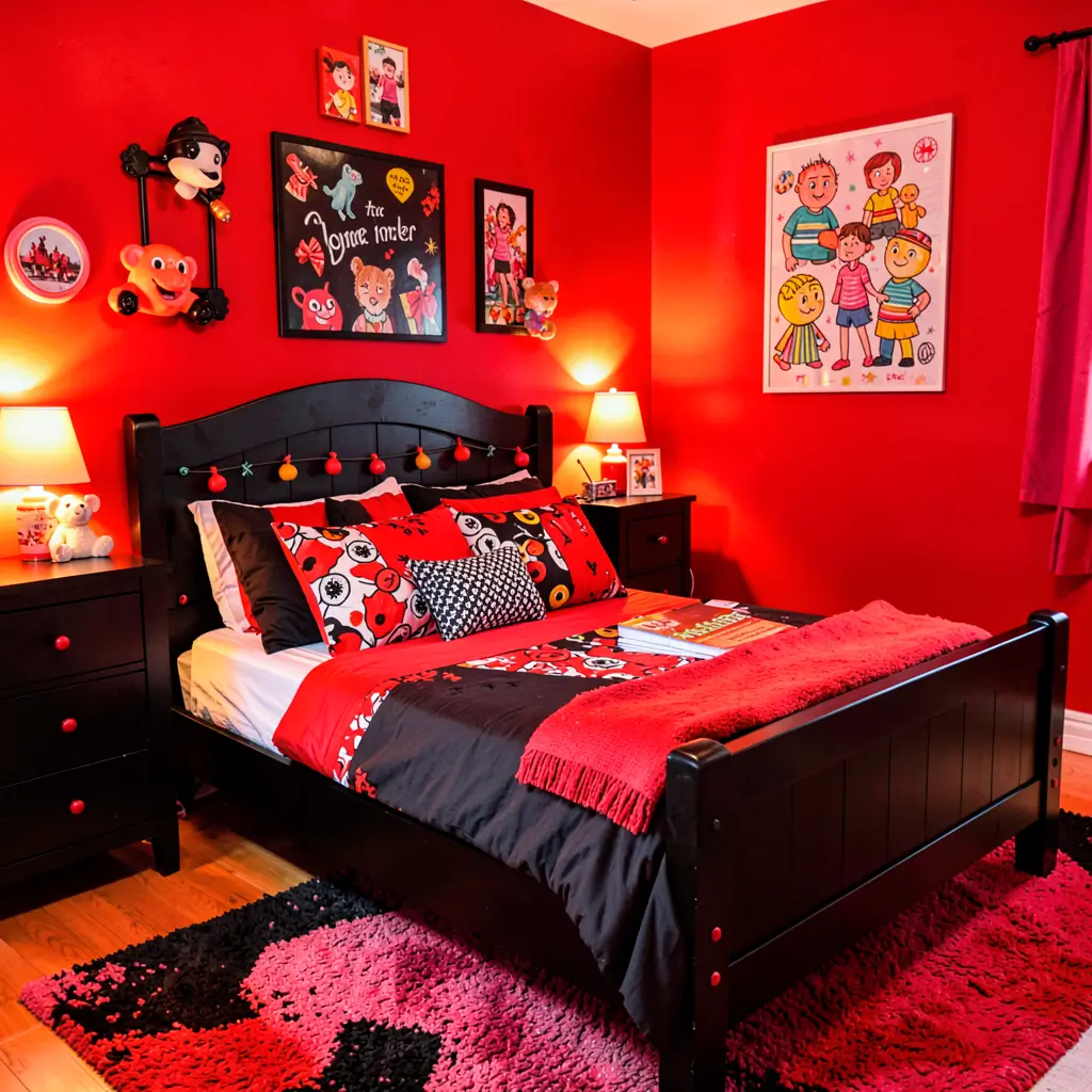 Red and black can absolutely be playful without looking like a teenager’s rebellion phase. This approach uses color as joy rather than aggression.