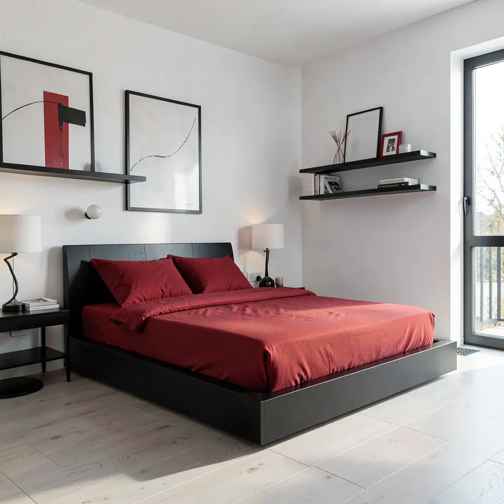 My minimalist red and black bedroom contains exactly five pops of red against a black and white base. That’s it. A red accent chair, two red pillows, red lamp base, and one abstract red artwork. The restraint creates sophistication that busy patterns could never achieve.