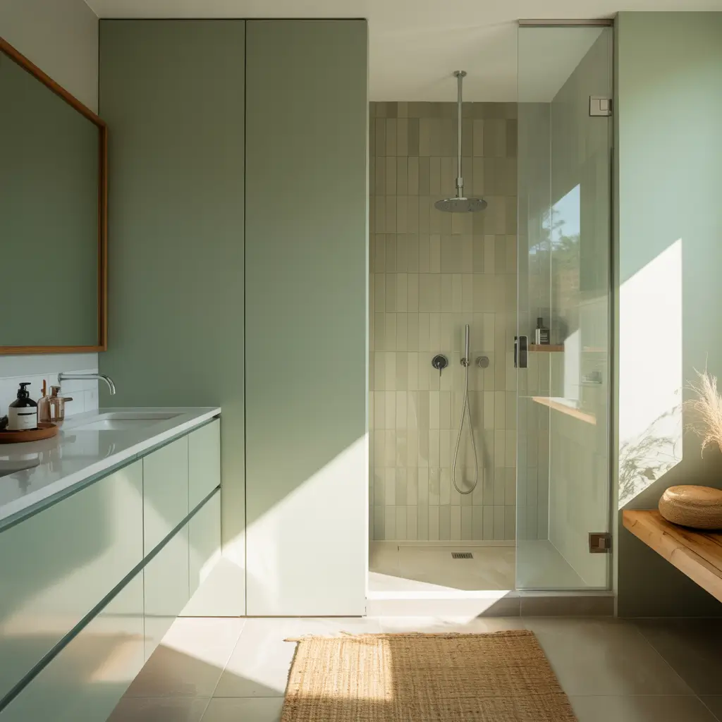 The key to modern sage green design? Simplicity and geometry. Think square tiles, floating vanities, frameless mirrors, and minimal accessories. You want your sage green to be the subtle hero, not competing with a bunch of fussy details.