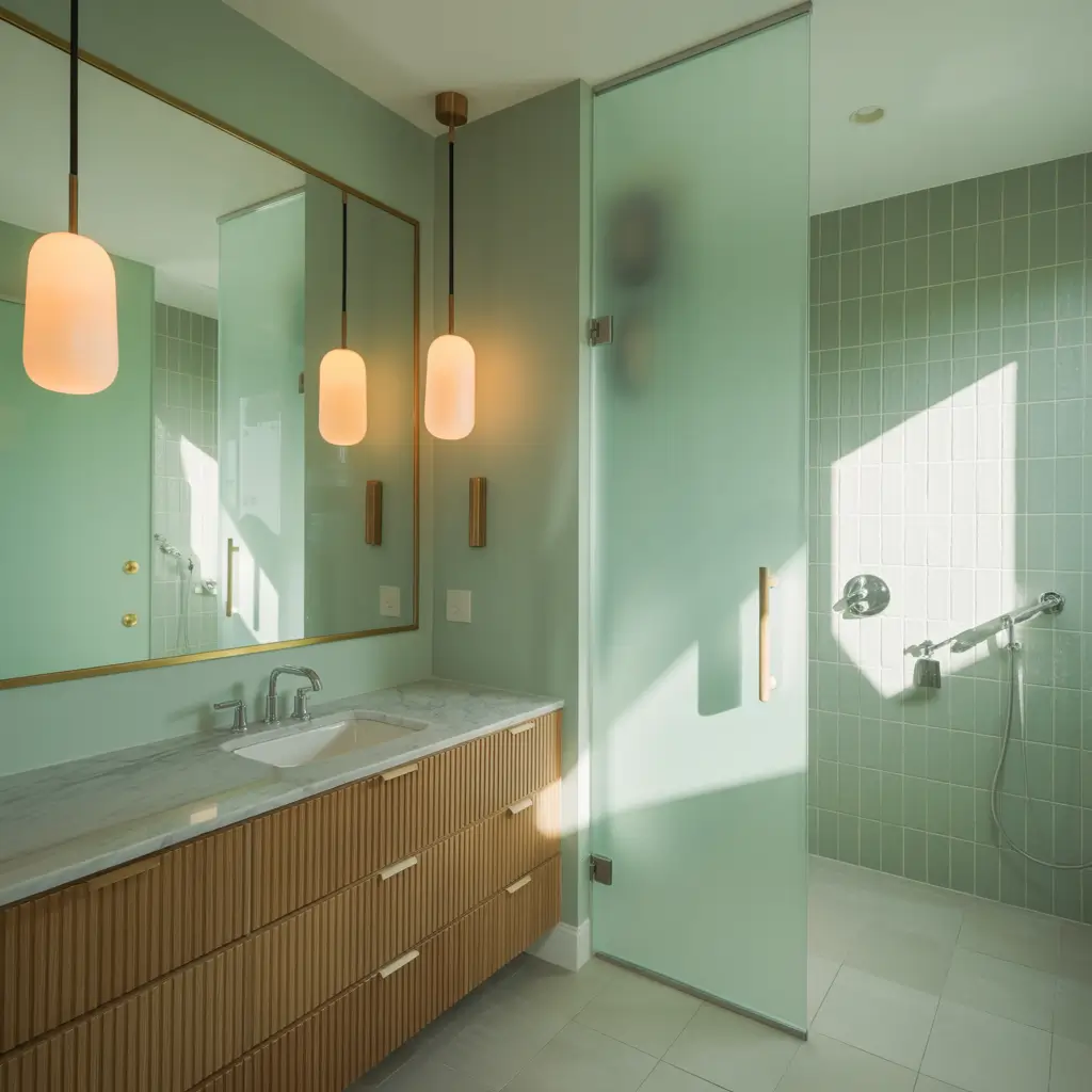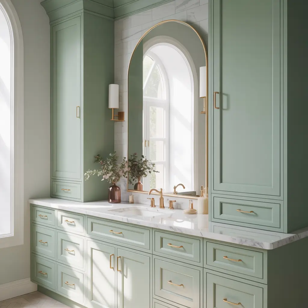 For vanities, you can go full sage green or two-toned. I’ve seen stunning bathrooms with sage green lower cabinets and white upper cabinets. This creates visual interest and prevents the room from feeling too dark.