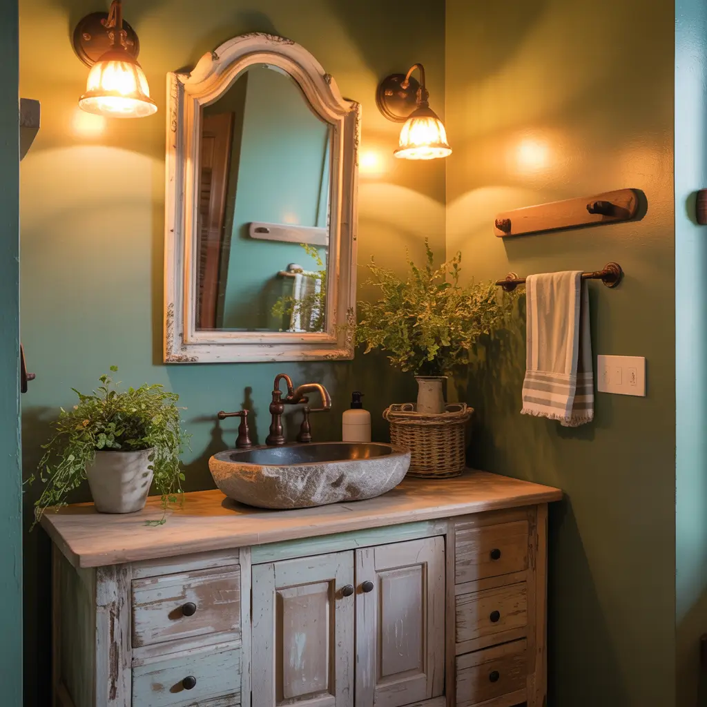I found an old wooden ladder at a flea market, painted the bottom half sage green, and propped it against my wall as a towel rack. It cost me $15 and instantly became my bathroom’s conversation piece. Rustic design encourages creativity and repurposing.