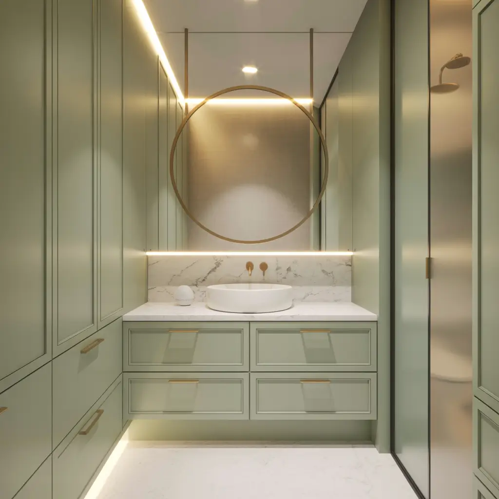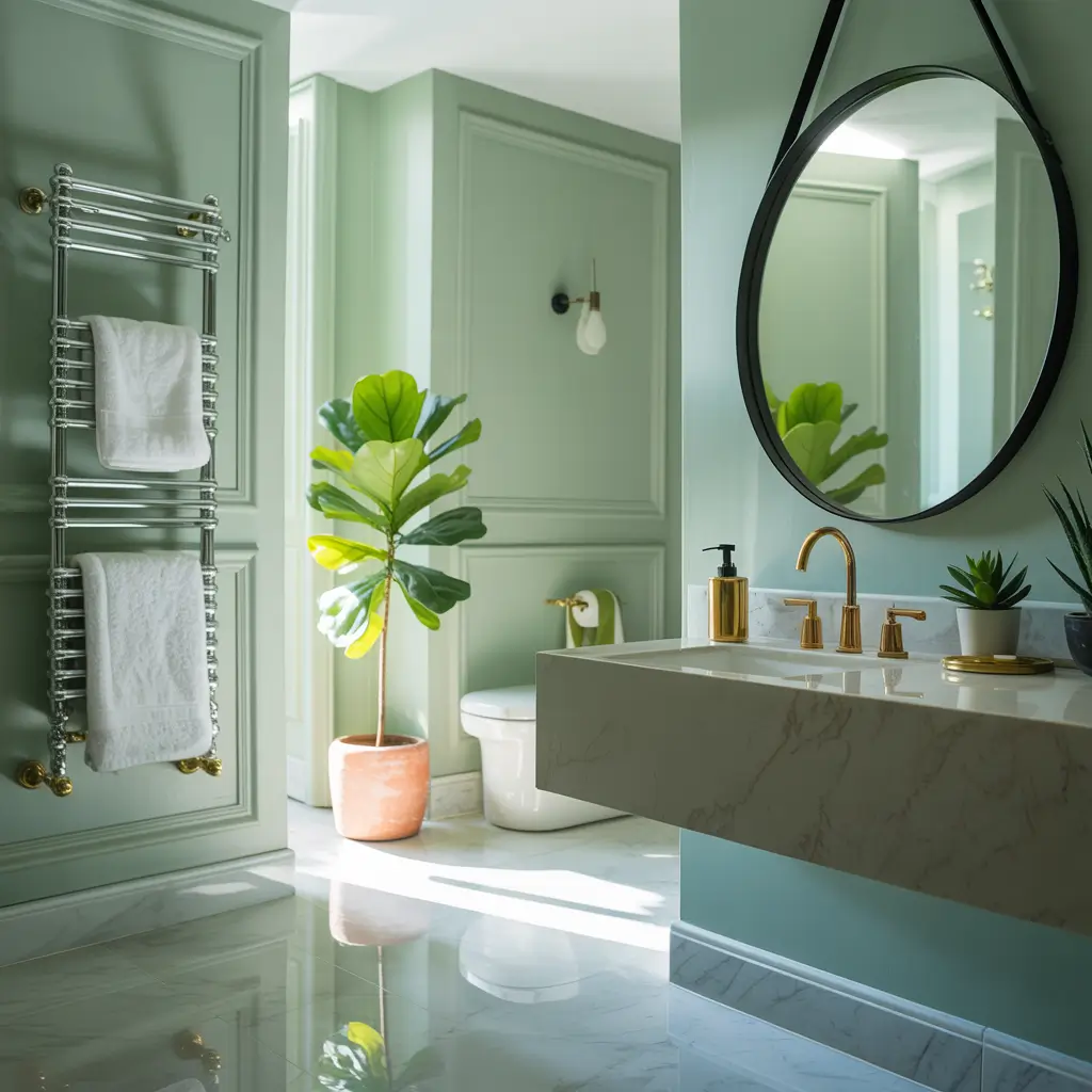 The warm gold tones balance the cool sage perfectly. You don’t need to go crazy here—subtle gold accents work better than drowning everything in metallic. Think gold-framed mirrors, towel bars, faucets, and light fixtures. Maybe throw in some gold-edged accessories like soap dispensers or toothbrush holders.