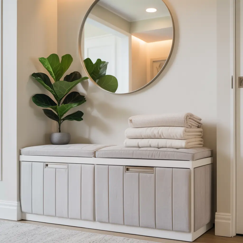 If you’re like me and need somewhere to actually sit while wrestling with boots, a storage bench is your best friend. Modern storage benches combine sleek aesthetics with serious functionality, giving you seating and hidden storage in one piece.