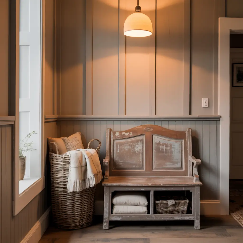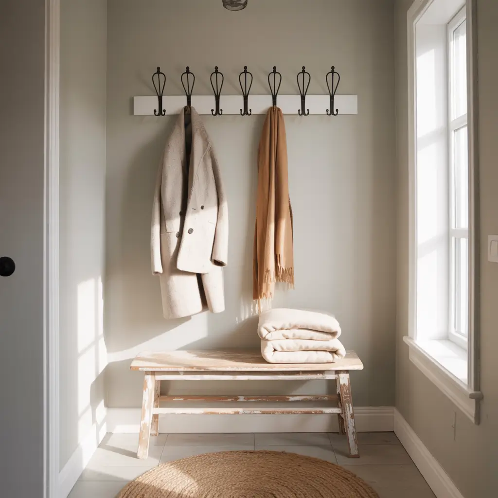 - Reclaimed wood coat hooks or a vintage hall tree