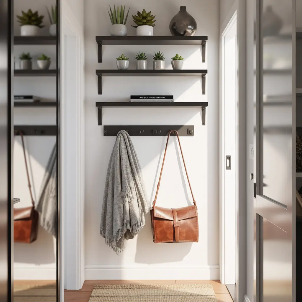 When floor space is non-existent, go vertical! Wall hooks and floating shelves maximize storage potential without eating up precious square footage. This approach keeps your entryway organized while maintaining clear walkway space.