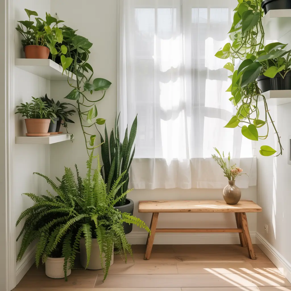 - Trailing plants (pothos, string of pearls) in hanging planters or on high shelves